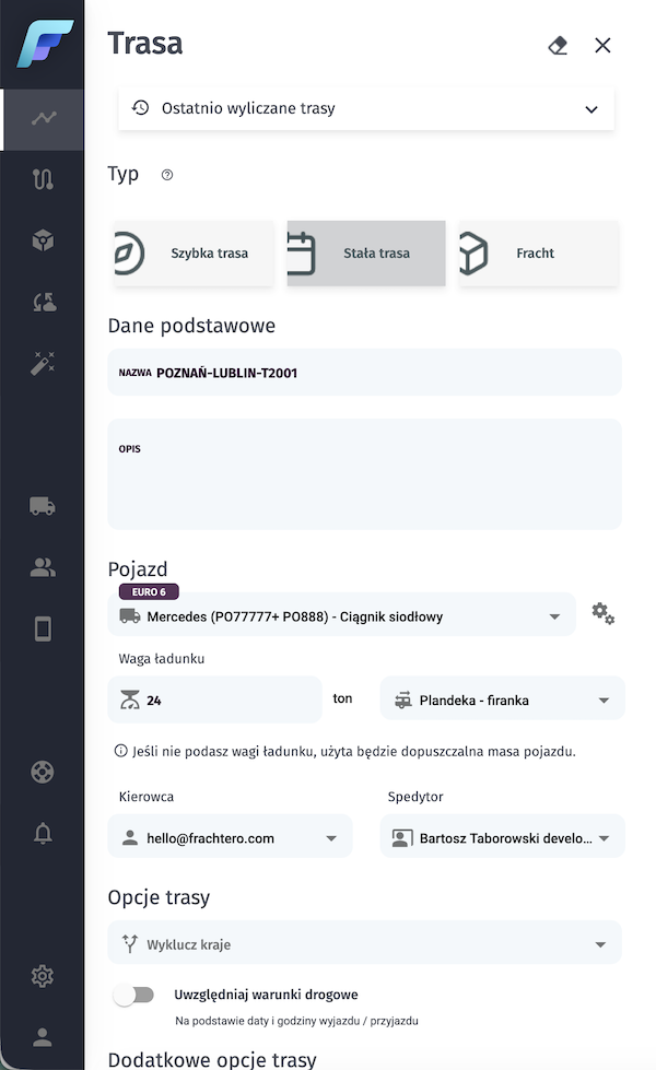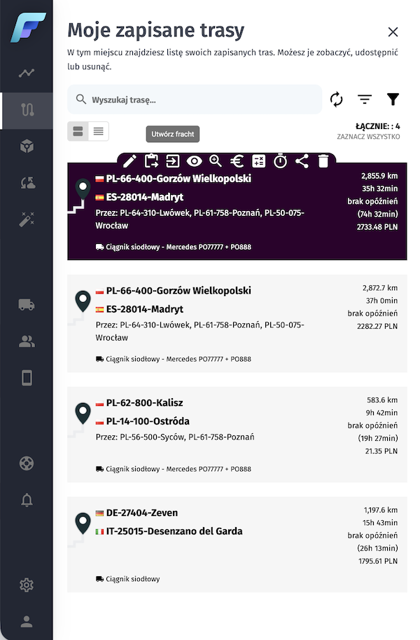 Zapisana trasa może być również wsadem do operacyjnego działania. Realizujesz frachty na stałych trasach? Wystarczy, że z poziomu widoku zapisanej trasy utworzysz nowy fracht, w którym zdefiniujesz więcej danych, które przydadzą Ci się w procesie realizacji. Więcej o tym procesie w naszym kolejnym artykule.