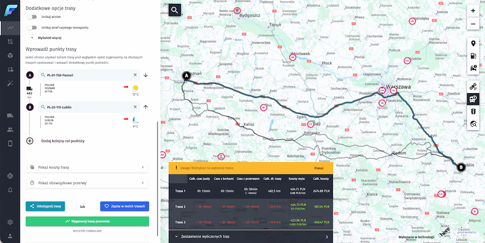 Zapisywanie trasy umożliwi Ci zachować wszelkie informacje do analizy w przyszłości (koszty myta, kształt trasy, ogólne koszty). Jeśli zechcesz i jest to dla Ciebie istotne, w dowolnym momencie porównasz jak trasa wyglądała na przykład rok wcześniej i jaką przyjąłeś dla niej stawkę dla konkretnego pojazdu.