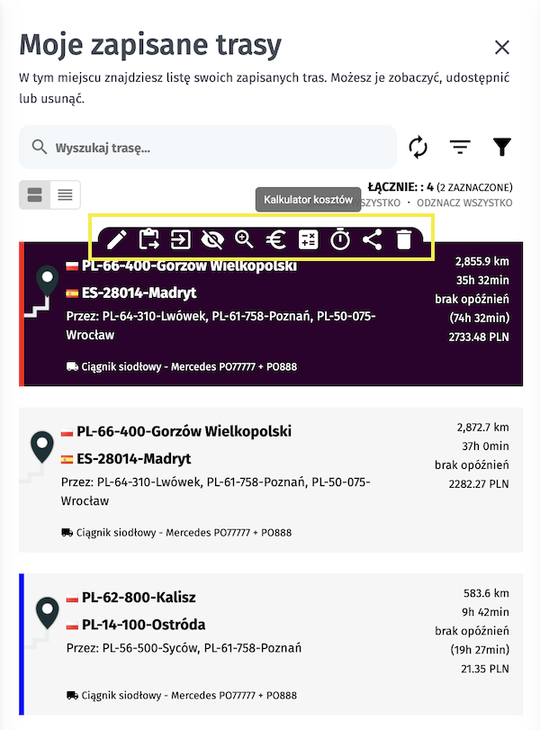 Na pasku nawigacyjnym po lewej stronie ekranu znajduje się ikona „Moje zapisane trasy„, a jej aktywowanie spowoduje wyświetlenie w panelu przegląd zapisanych przez Ciebie kalkulacji.
