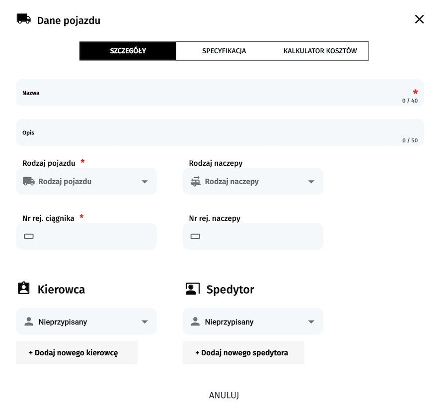 W pierwszej zakładce definiujemy podstawowe dane dotyczące pojazdu. Dodanie kierowcy oraz spedytora ma znaczenie w szczególności, gdy wykorzystujesz tryb zarządzania frachtami i istotnym elementem Twoich operacji jest współpraca na lini kierowca-spedytor.