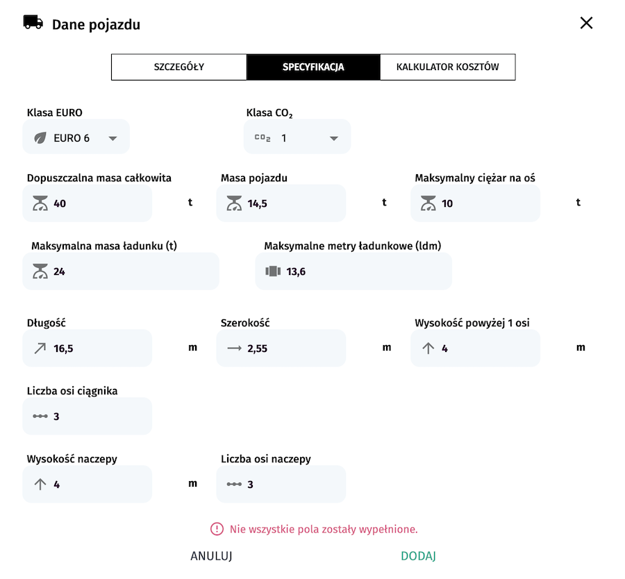 Dodawanie pojazdu wraz z parametrami