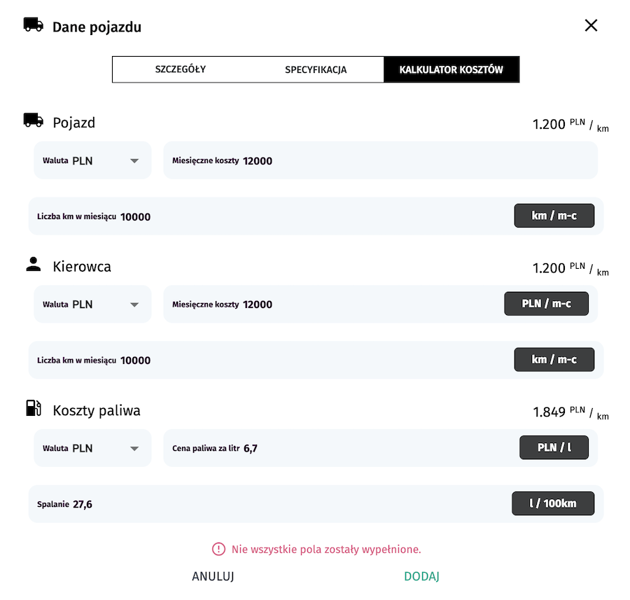 Ostatnia zakładka ma znaczenie, jeżeli chcemy wyliczać całkowite koszty transportu w oparciu o jedną z czterech obecnie dostępnych formuł w serwisie.