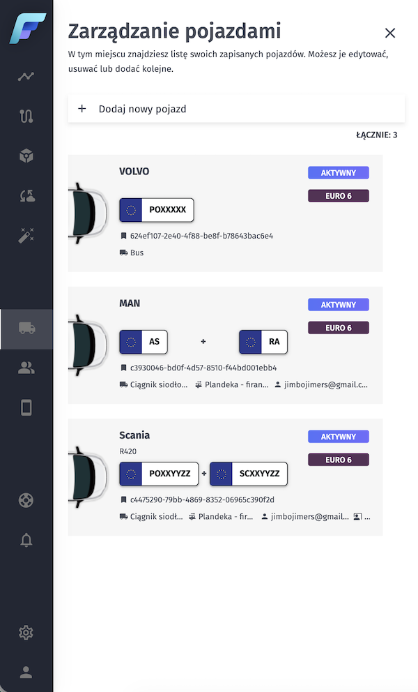 Z poziomu głównego menu, które znajduje się w pasku po lewej stronie ekranu wywołasz panel zarządzania pojazdami, w którym będziesz mógł zdefiniować pojazdy w ramach swojej floty.
